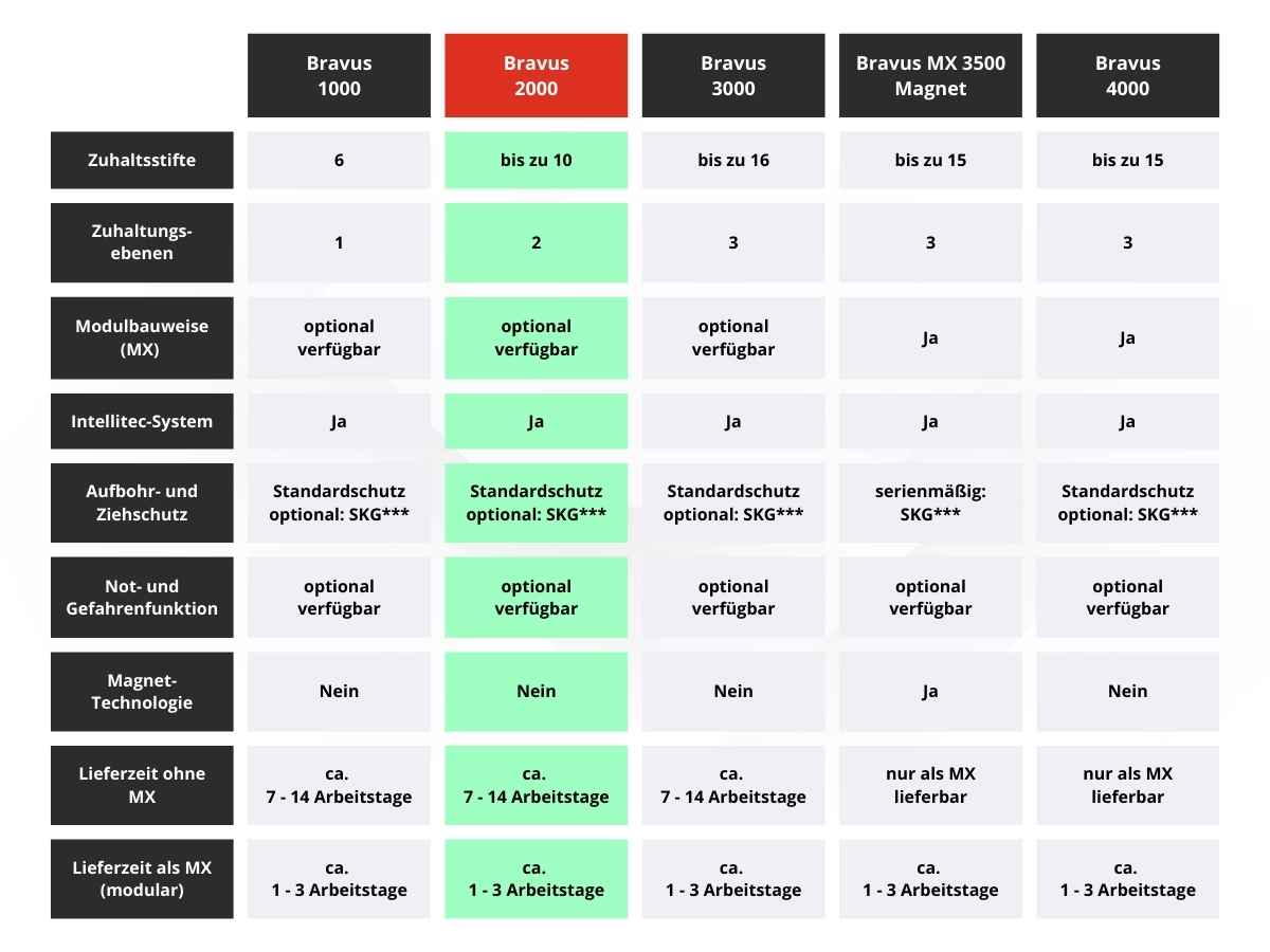 | Bravus 3000 | 3 | ❌ | bis 16 Stifte / 3 Ebenen | ✅ optional | ❌ | Einfamilienhäuser mit erhöhtem Sicherheitsanspruch |