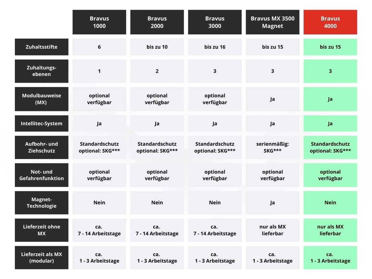 | Bravus 3500 MX | 4 | ✅ | bis 15 Stifte / 3 Ebenen | ✅ serienmäßig | ✅ | Türen mit Smartlock, Fluchtwegen oder sensiblen Bereichen |