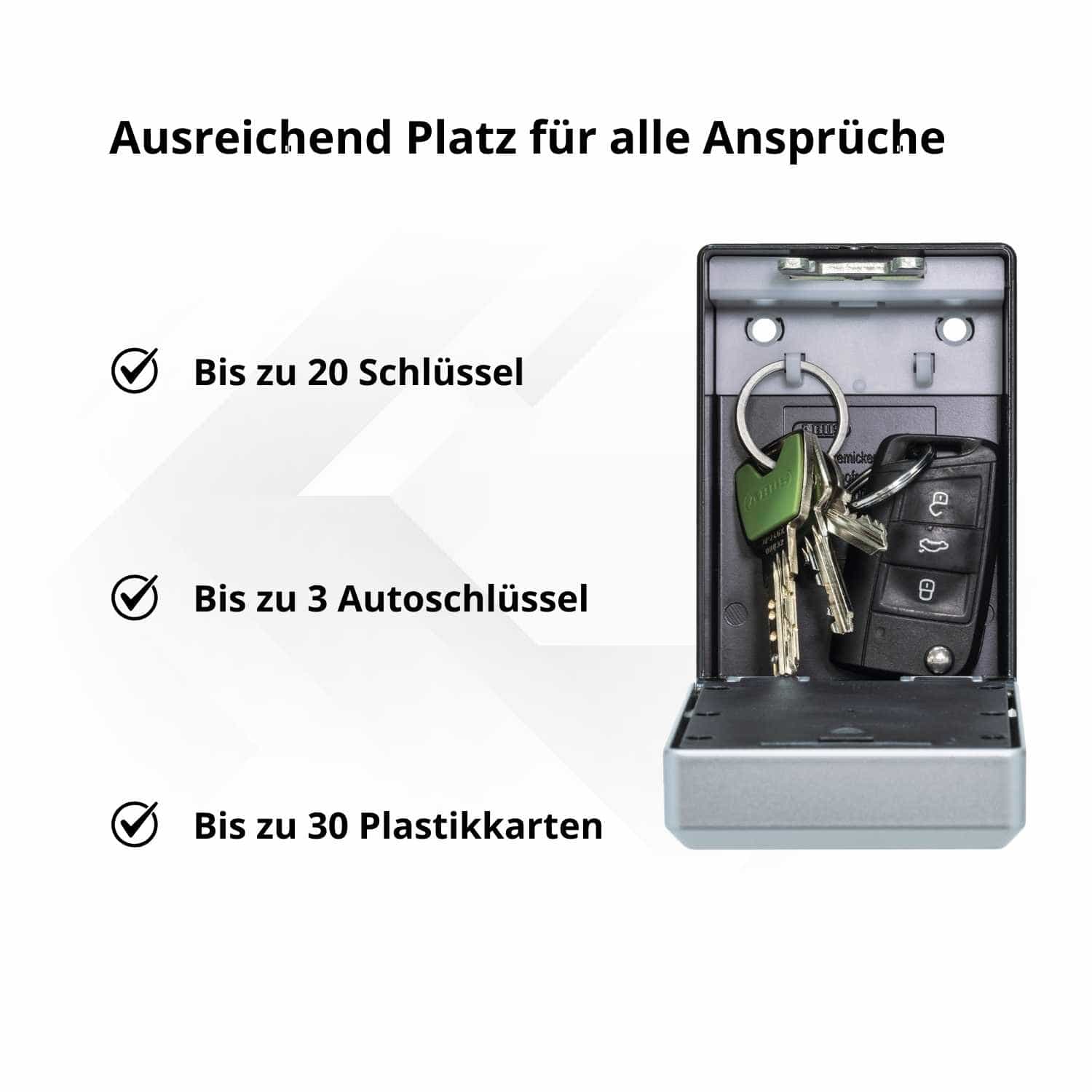 - Smarte Schlüsselaufbewahrung: Sichere Verwahrung von bis zu 20 Schlüsseln oder 30 Plastikkarten.