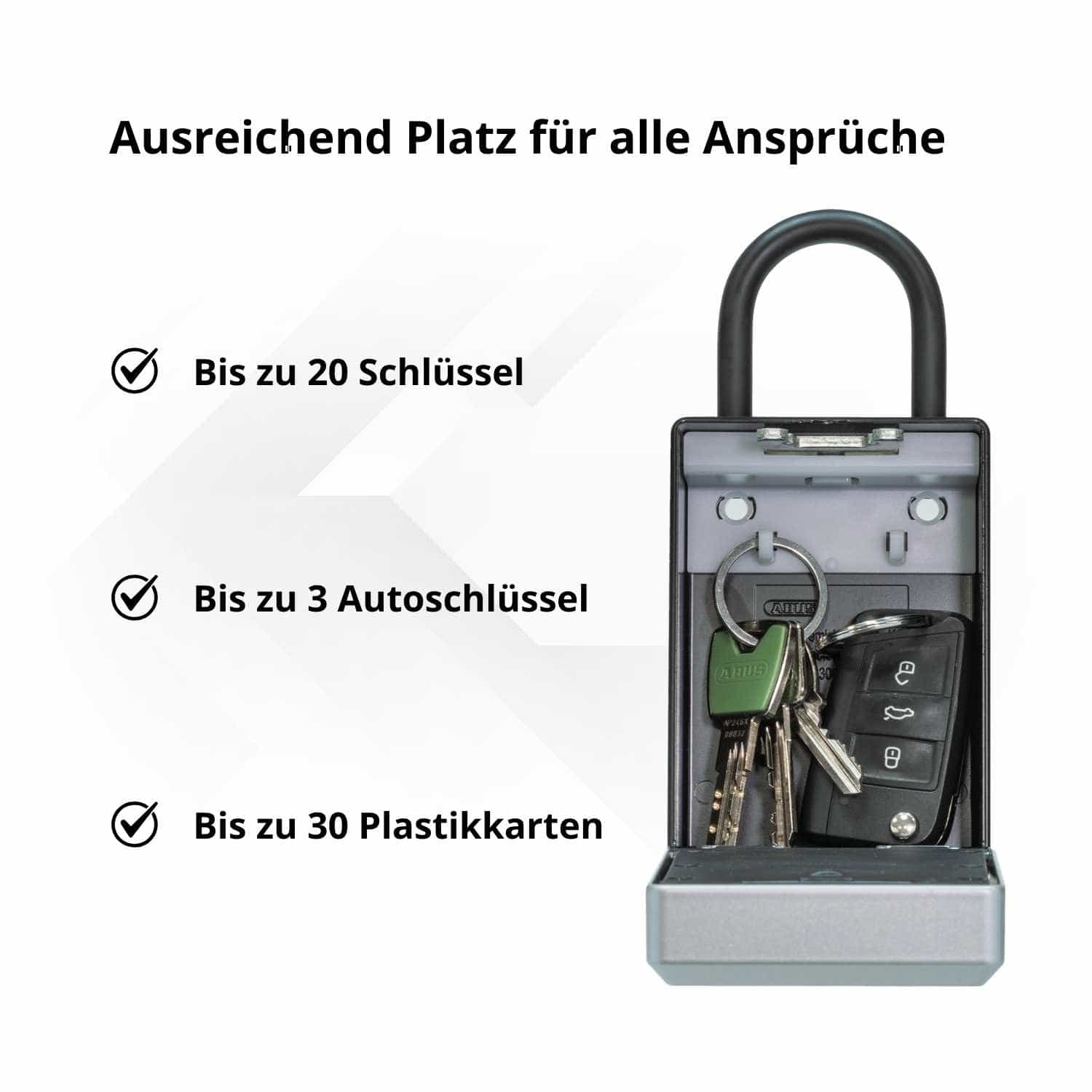 - Smarte Schlüsselaufbewahrung: Sichere Verwahrung von bis zu 20 Schlüsseln oder 30 Plastikkarten.