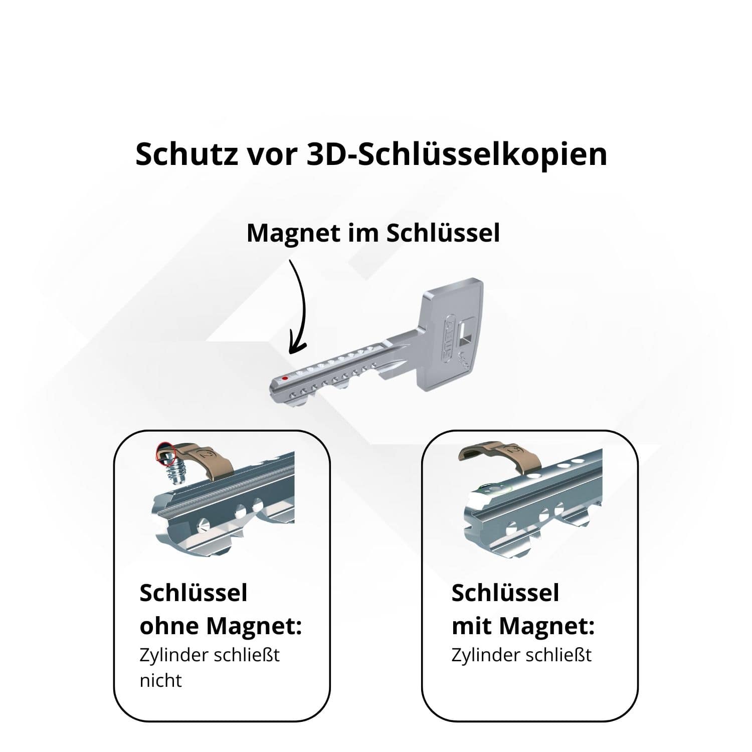 Der Magnet im Schlüssel verhindert das Kopieren durch intelligente Schlüssel Kopierer oder 3D-Drucker. Sie können sich sicher sein, dass nur Ihr Schlüssel die Tür öffnen kann.