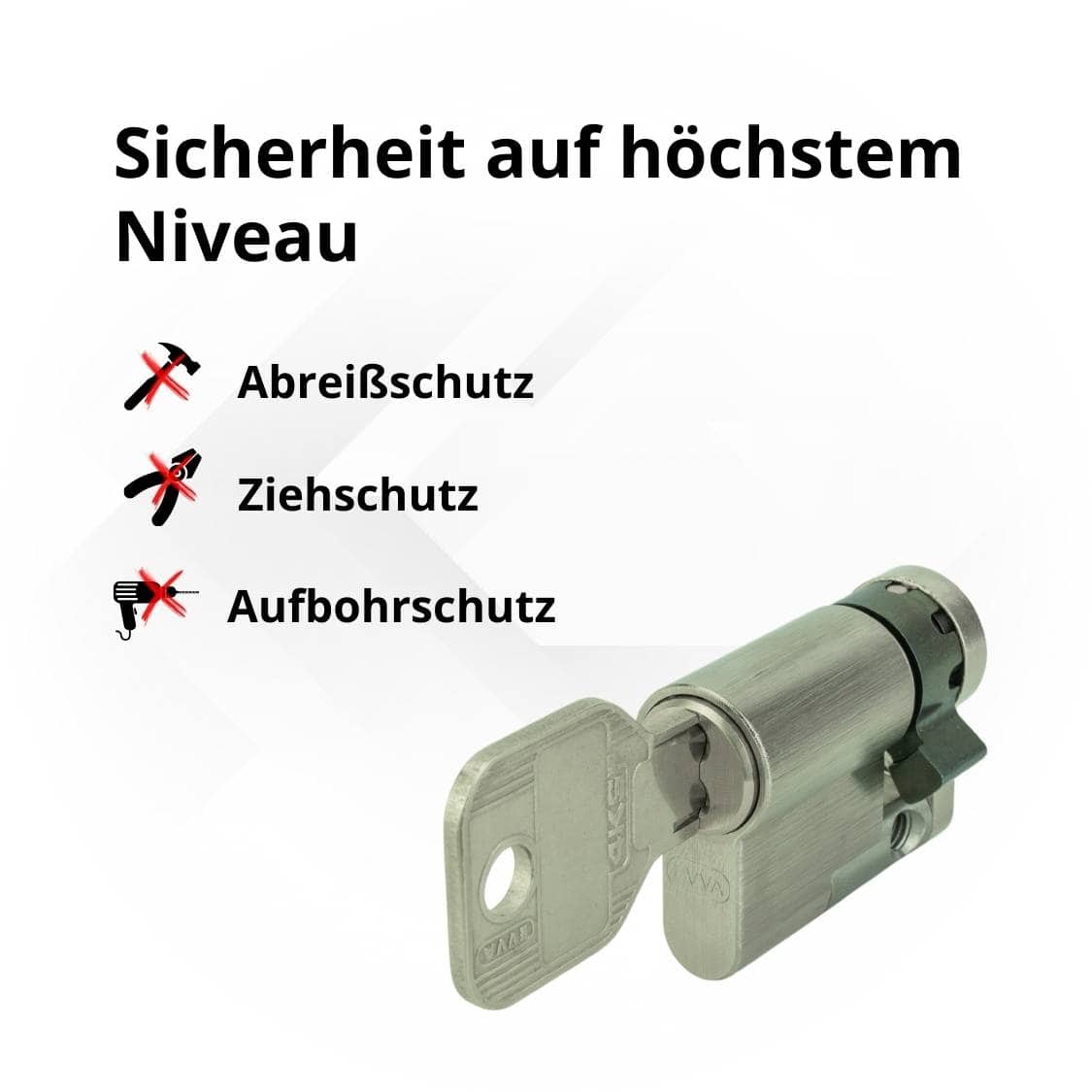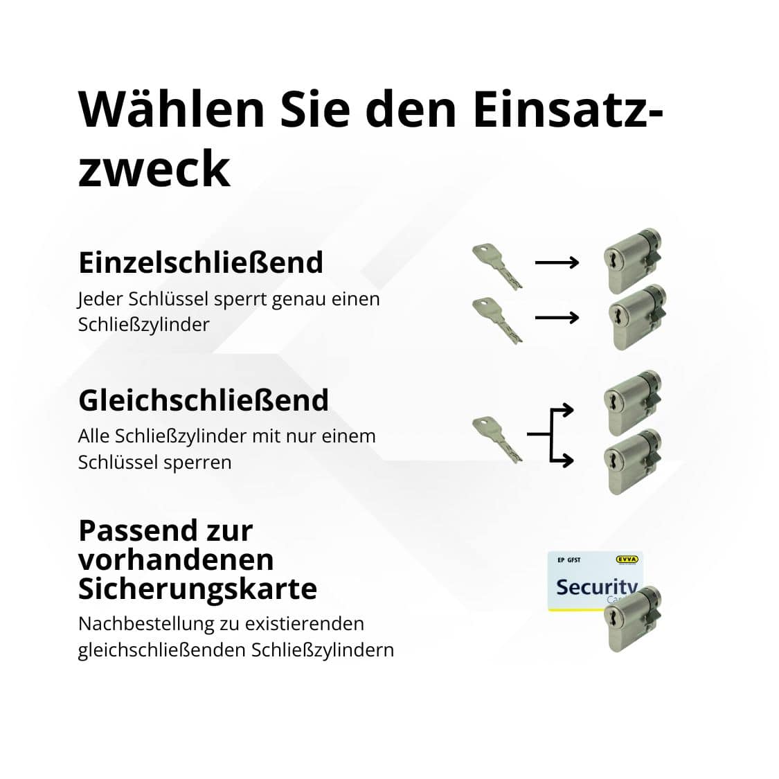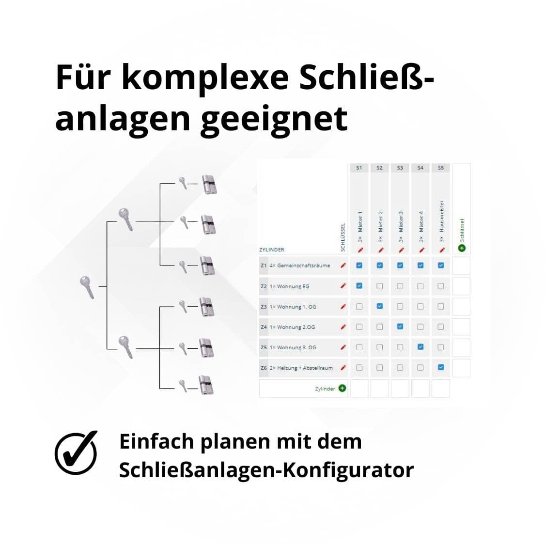 - bei einzel- oder gleichschließenden Halbzylindern erhalten Sie je Halbzylinder 3 Schlüssel, bei Nachbestellungen 1 Schlüssel je Zylinder