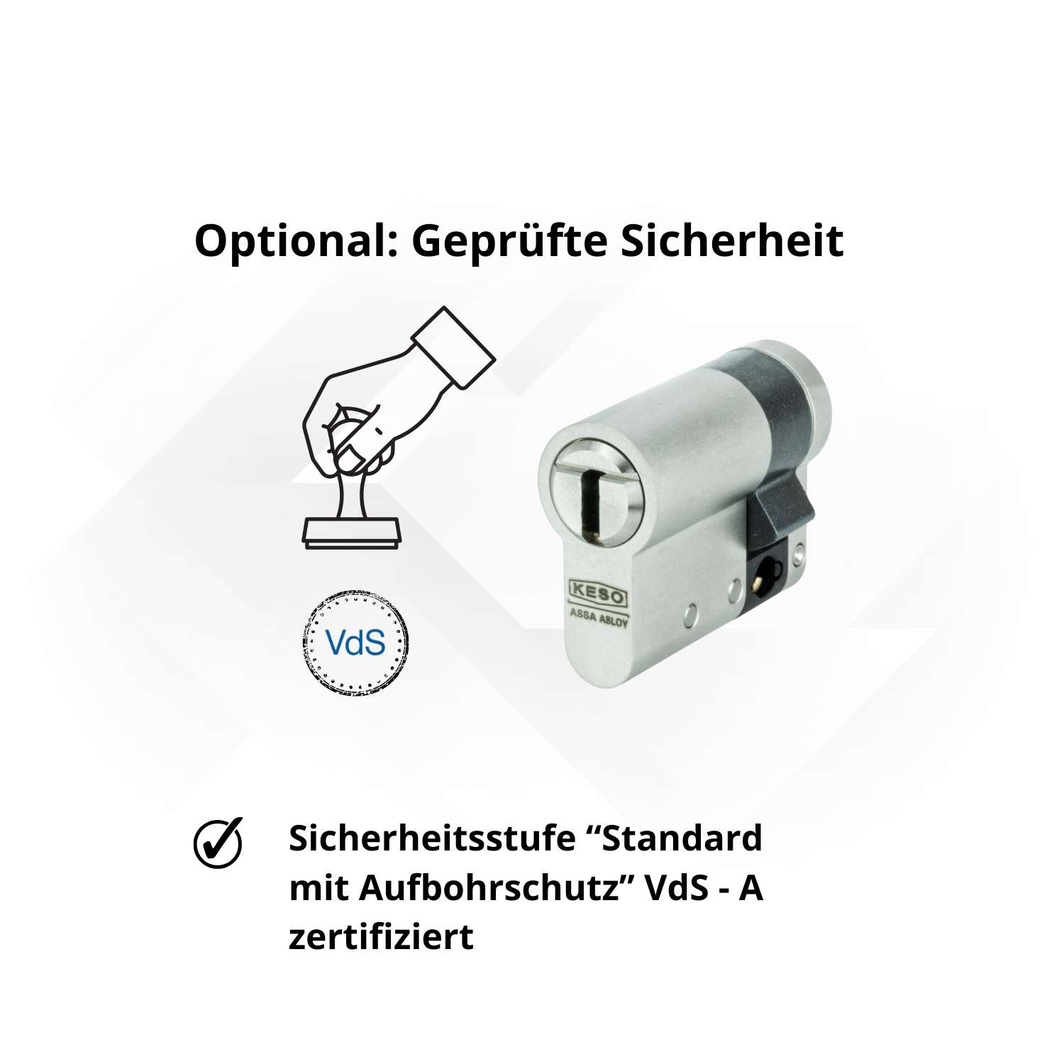Für noch höhere Sicherheitsansprüche empfehlen wir den KESO 8000 Omega² Halbzylinder Advanced mit VdS B-Zertifizierung, verstärktem Bohrschutz und patentierter Omega²-Technologie im Schlüssel.