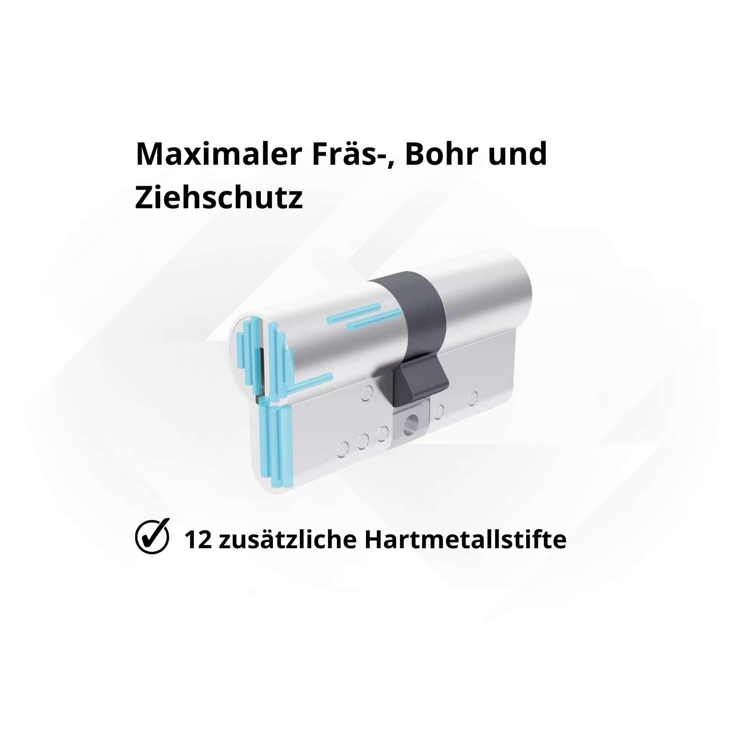 Der massive Zylinderkörper aus Chromnickelstahl kombiniert gehärtete Stahlzuhaltungen mit 12 zusätzlichen Hartmetallstiften. Integrierter Fräs-, Zieh- und Aufbohrschutz sorgen für eine mehrschichtige Widerstandslinie gegen physische Angriffe. Die modulare Bauweise ermöglicht zudem eine flexible Integration in individuelle Schließsysteme – ideal bei besonderen Türsituationen oder wechselnden Anforderungen.