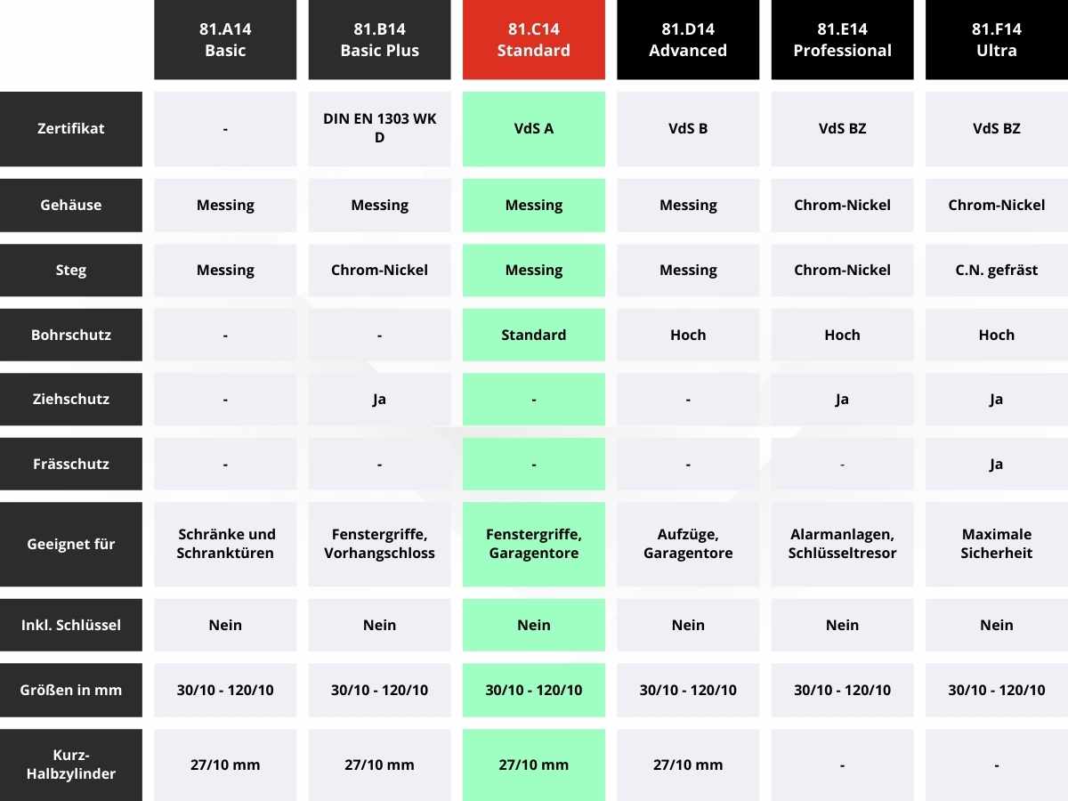 - 15 Stiftzuhaltungen verteilt auf fünf mögliche Linien (versetzt verteilt auf zwei Seiten- und eine Hochkantlinie)