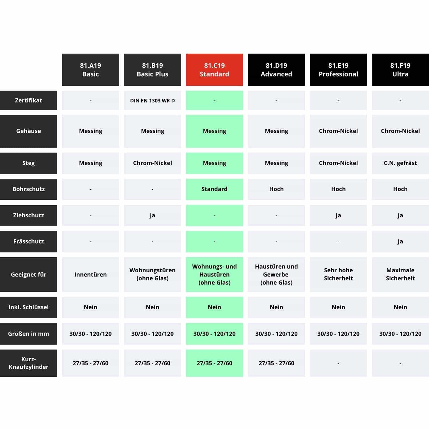 | KESO 8000 Omega² Knaufzylinder Basic | Basic | – | 15 Zuhaltungen / 3 Ebenen | Innenräume, Nebenräume ohne hohe Schutzanforderung |